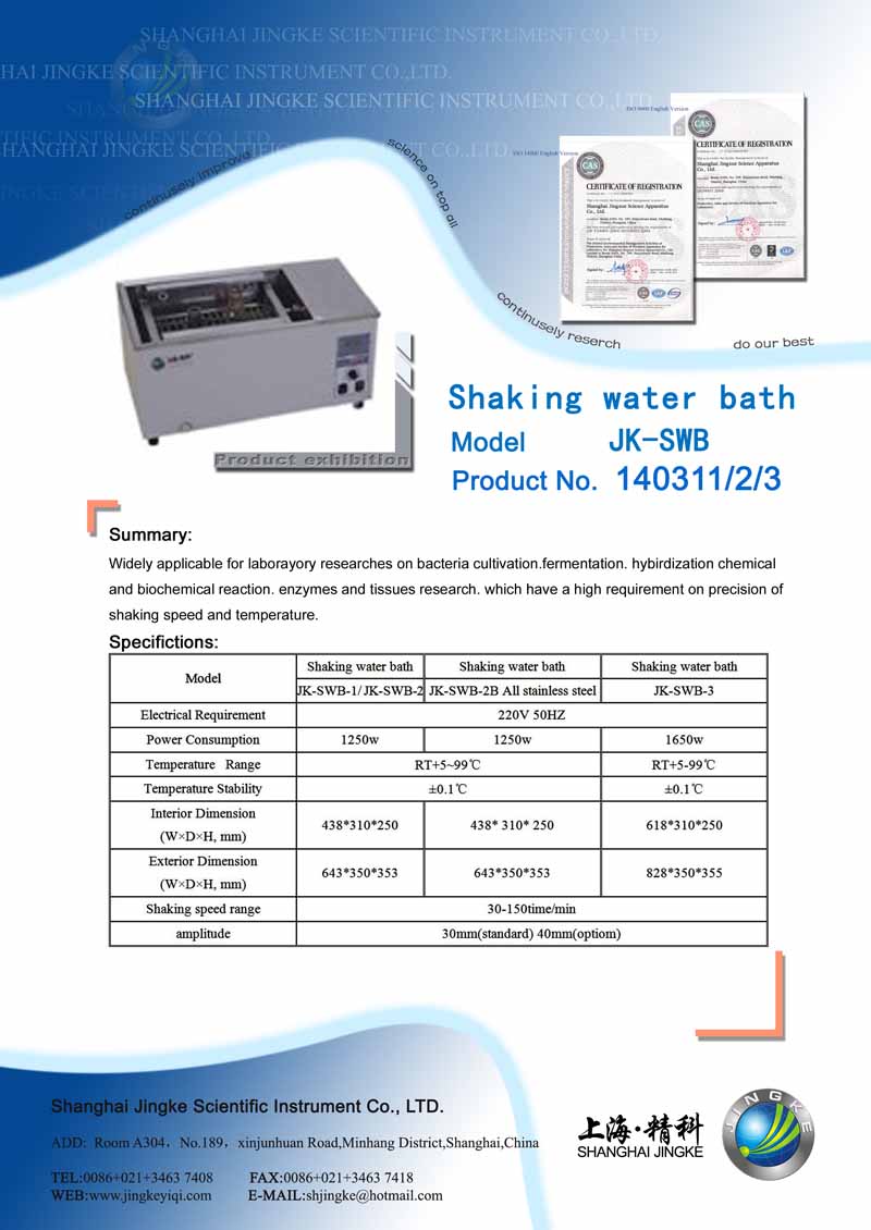 Shaking water bath Summary: Widely applicable for laborayory researches on bacteria cultivation.fermentation. hybirdization chemical and biochemical reaction. enzymes and tissues research. which have a high requirement on precision of shaking speed and temperature. Specifictions: