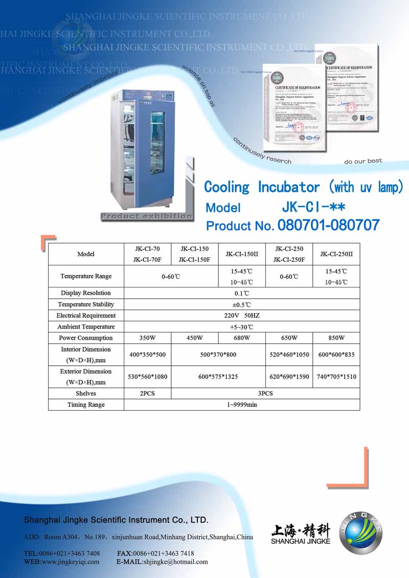 JK-CI-250 Cooling Incubator (with uv lamp) Serve for preserve culture medium, serum, medicine as well as microorganism training and environmental testing etc.s Features: 1. Polished stainless-steel chamber, semicircular arcs at corners for easy cleaning, and the space between the shelves in the chamber is adjustable. 2. Latest PID controller 3. R134a refrigerant, imported compressor (DANFOSS) 4. Independent temperature-limiting alarm system ensures experiments run safely. (option) 5. Printer connector and RS485 connector are options which can connect printer and computer to record the parameters and the variations of temperature.(option) 6. There is a 25mm instruction connection hole on the left side of the chamber for easy testing operation and temperature measurement.