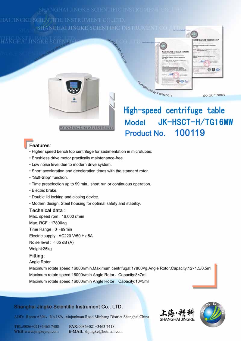 JK-HSCT-H/TG16MW High-speed centrifuge table Features: • Higher speed bench top centrifuge for sedimentation in microtubes. Technical data : Max. speed rpm : 16,000 r/min Angle Rotor Maximum rotate speed:16000r/min Angle Rotor,Capacity:8×7ml Maximum rotate speed:16000r/min Angle Rotor,Capacity:10×5ml |