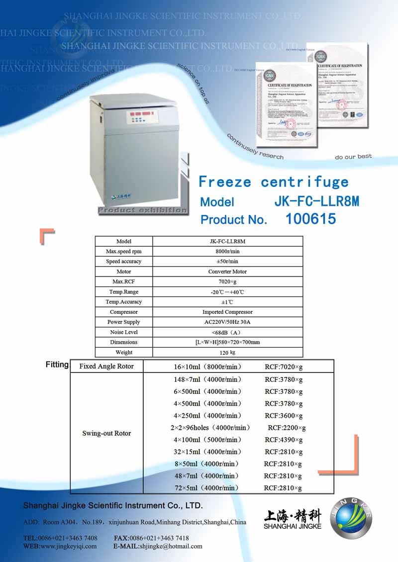JK-FC-LLR8M Freeze centrifuge Comtrol by microcomputer,digigal display,frequency control of motor speed,touching panel,can be operated by programming,programmable operation with RCF automatic computing and setting,adjustable rise-and-fall speed. Ensure safety in using thd instrument,it is installed with unbalanced unit, over-speed and over-temperature protection device.And allocated multiple rotors apply to radioimmunity,biochemistry and separating blood products. Technical data