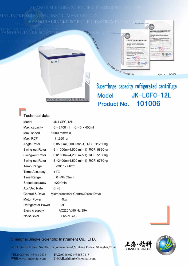 Product name: | JK-LCFC-12L Large capacity freeze centrifuge Swing rotor:capacity:4×2400ml (6×3×400) |