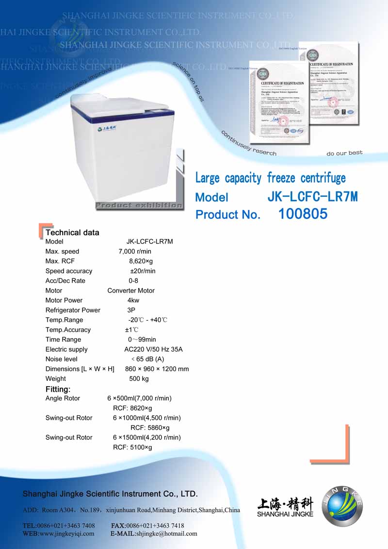 Product name: JK-LCFC-LR7M Large capacity freeze centrifuge