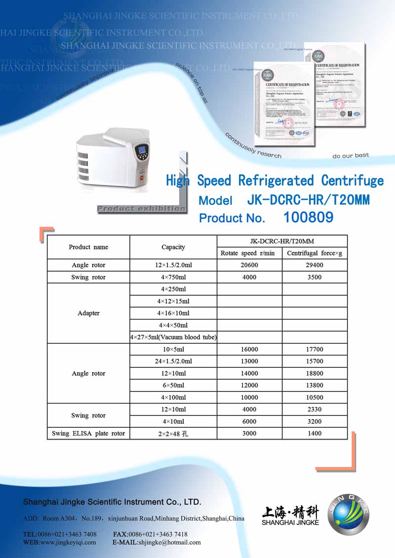 Product name: | JK-DCRC-HR/T20MM High Speed Refrigerated Centrifuge |