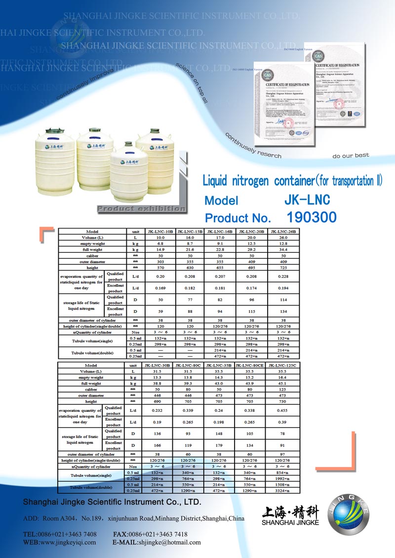 JK-LNC400 Liquid nitrogen container(large caliber) JK-NDS-80 Liquid nitrogen container(for air transportation) JK-NDS-3 Liquid nitrogen container(for air transportation) JK-LNC-125C Liquid nitrogen container(for storage II)(with canister ) |