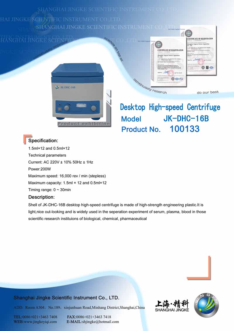 JK-DHC-16B Desktop High-speed Centrifuge Specification: 1.5ml×12 and 0.5ml×12 Technical parameters Current: AC 220V ± 10% 50Hz ± 1Hz Power:200W Maximum speed: 16,000 rev / min (stepless) Maximum capacity: 1.5ml × 12 and 0.5ml×12 Timing range: 0 ~ 30min Description: Shell of JK-DHC-16B desktop high-speed centrifuge is made of high-strength engineering plastic.It is light,nice out-looking and is widely used in the seperation experiment of serum, plasma, blood in those scientific research instituions of biological, chemical, pharmaceutical