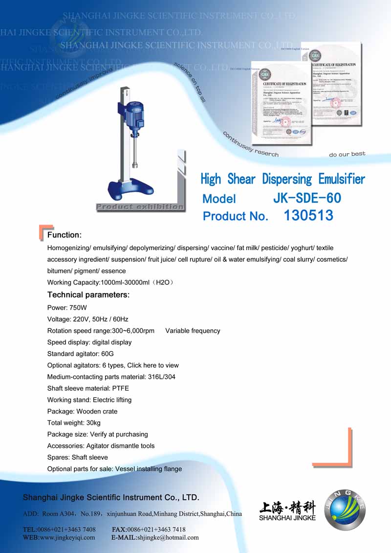 Product name: | JK-SDE-60 High Shear Dispersing Emulsifier |