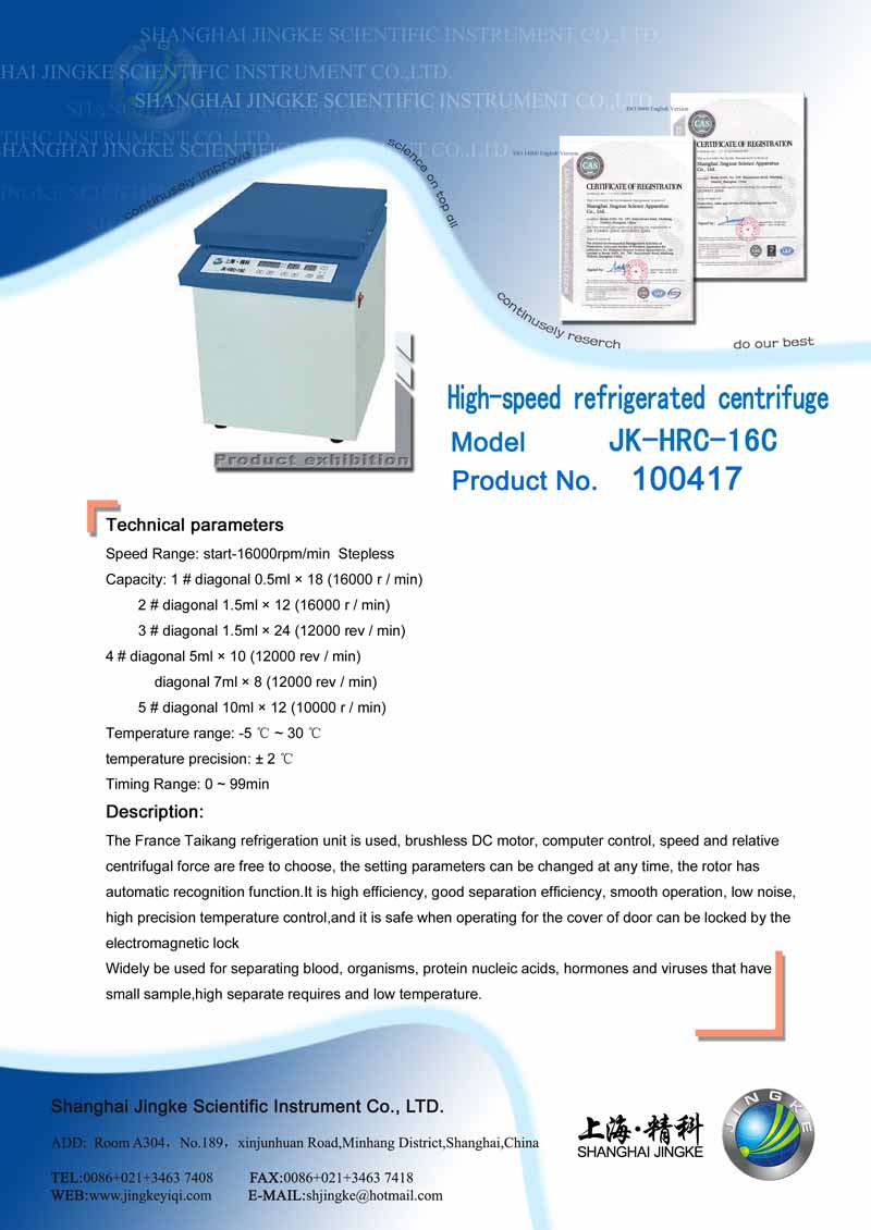 Product name: | JK-HRC-16C High-speed Refrigerated centrifuge |