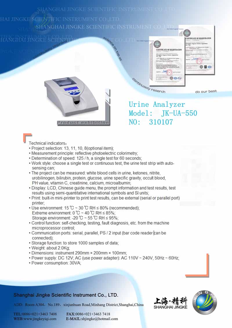 JK-UA-550 Urine Analyzer Technical indicators: • Project selection: 13, 11, 10, 8(optional item); • Measurement principle: reflective photoelectric colorimetry; • Determination of speed: 125 / h, a single test for 60 seconds; • Work style: choose a single test or continuous test, the urine test strip with auto-sensing can; • The project can be measured: white blood cells in urine, ketones, nitrite, urobilinogen, bilirubin, protein, glucose, urine specific gravity, occult blood, PH value, vitamin C, creatinine, calcium, microalbumin; • Print: built-in mini-printer to print test results, can be external (serial or parallel port) printer; • Use environment: 15 ℃ ~ 30 ℃ RH ≤ 80% (recommended); Extreme environment: 0 ℃ ~ 40 ℃ RH ≤ 85%; Storage environment: -20 ℃ ~ 55 ℃ RH ≤ 95%; • Control function: self-checking, testing, fault diagnosis, etc. from the machine microprocessor control; • Communication ports: serial, parallel, PS / 2 input (bar code reader can be connected); • Storage function: to store 1000 samples of data; • Weight: about 2.0Kg; • Dimensions: instrument 290mm × 200mm × 100mm; • Power supply: DC 12V; AC (use power adapter): AC 110V ~ 240V, 50Hz ~ 60Hz; • Power consumption: 30VA;