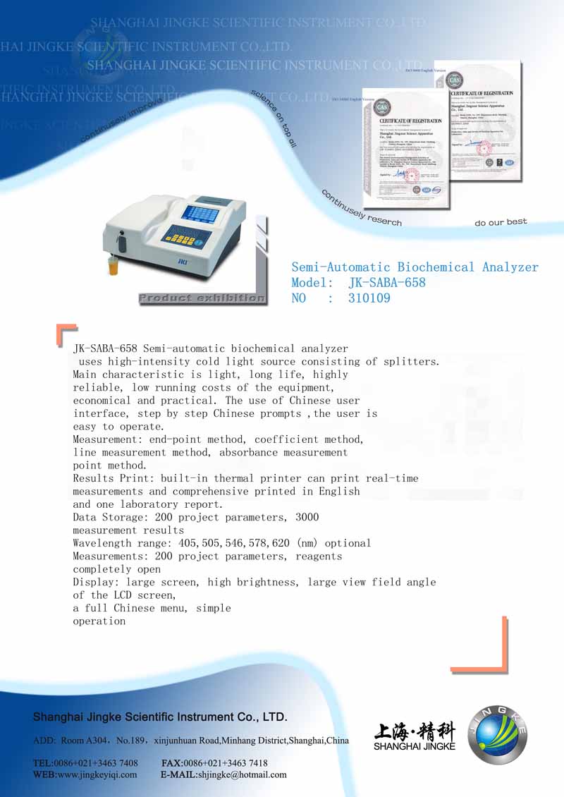 JK-SABA-658 Semi-Automatic Biochemical Analyzer JK-SABA-658 Semi-automatic biochemical analyzer uses high-intensity cold light source consisting of splitters. Main characteristic is light, long life, highly reliable, low running costs of the equipment, economical and practical. The use of Chinese user interface, step by step Chinese prompts ,the user is easy to operate. Measurement: end-point method, coefficient method, line measurement method, absorbance measurement point method. Results Print: built-in thermal printer can print real-time measurements and comprehensive printed in English and one laboratory report. Data Storage: 200 project parameters, 3000 measurement results Wavelength range: 405,505,546,578,620 (nm) optional Measurements: 200 project parameters, reagents completely open Display: large screen, high brightness, large view field angle of the LCD screen, a full Chinese menu, simple operation