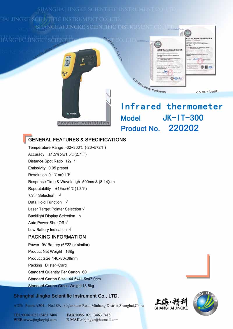 Name:Infrared thermometer JK-IT-300 Model:JK-IT-300 Product Description