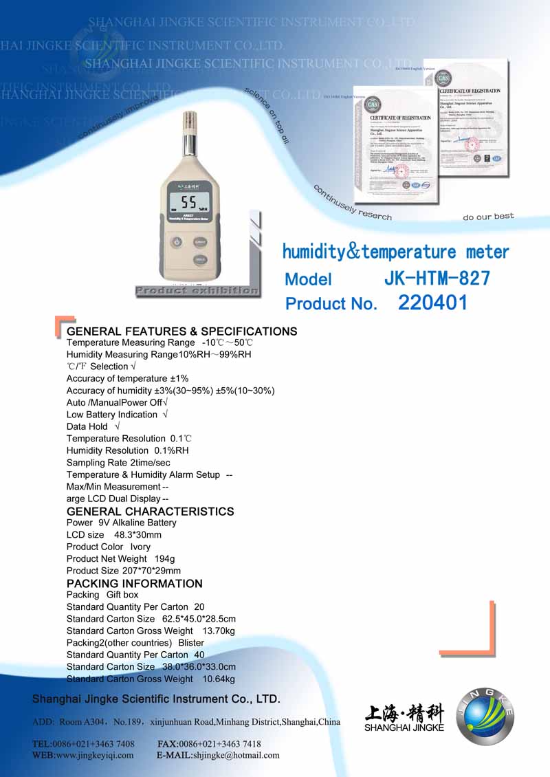 Name:JK-HTM-827 HUMIDITY & TEMPERATURE METER Model:JK-HTM-827 Product Description GENERAL FEATURES & SPECIFICATIONS