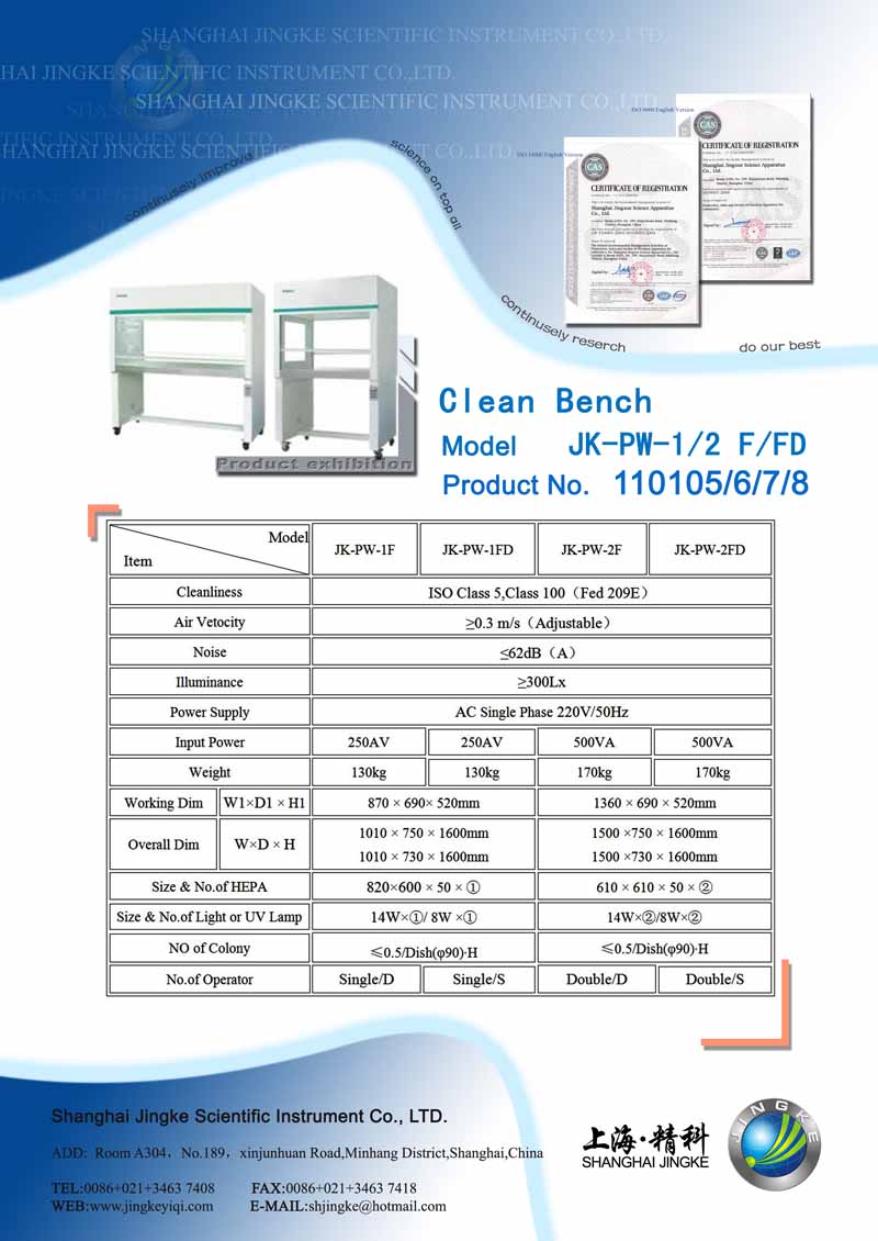 Clean Bench Product Information: Series JK-PW Clean Bench with vertical laminar flow is kind of all-purpose clean equipment that supply local high cleanliness work environment. It can be widely used in medical health, laboratories, etc. It has good effect in improving process condition and enhancing product quality and finished products rate. Characteristies: Sliding door system with patent technology free to place Integrative stainless steel worktable easy toclean Optional single double sides control Mutual exclusive light and sterilizing system Satisfy the safety requirement of medical device Technical parameters: