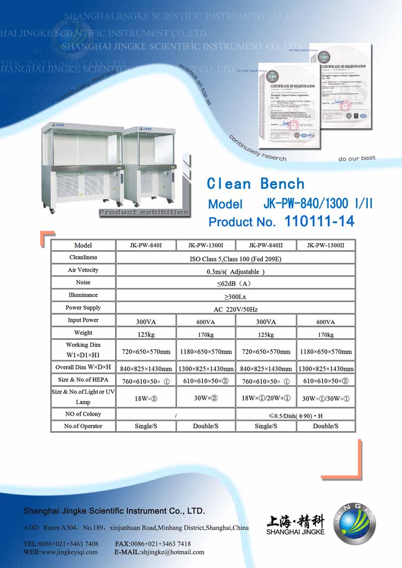 Clean Bench Product Information: Series JK-PW Clean Bench is local air clean equipment with horizontal laminar flow, which can provide the working environment without duct and give a better result in improving the process condition and has full assurance of product’s high accuracy and good responsibility. So it has the extensive applications for different fields. Characteristics: Compact air supply in the front and open uniform air exhaust with large area Integrative stainless stell worktable with curving side in the front Air velocity self-control by one starting device Mutual exclusive light and sterilizing system Technical parameters: