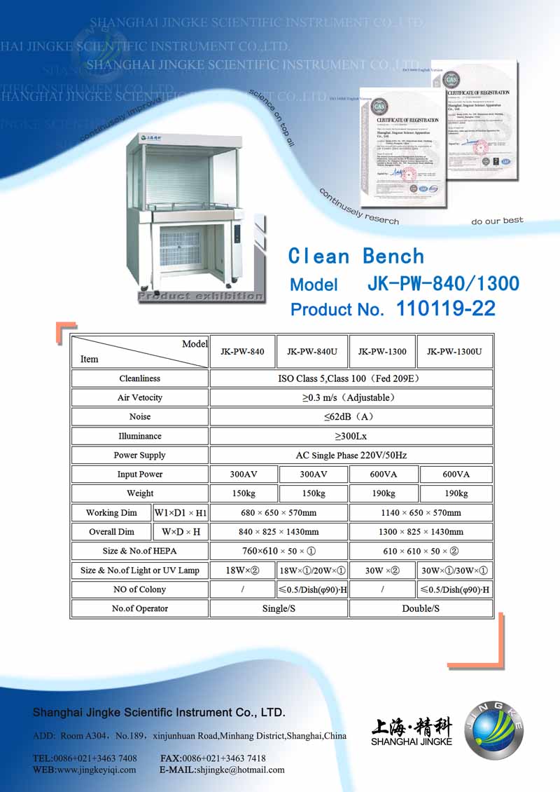 Clean Bench Product Information: Series JK-PW Clean Bench is local air clean equipment with horizontal laminar flow, which can provide the working environment without duct and give a better result in improving the process condition and has full assurance of product’s high accuracy and good responsibility. So it has the extensive applications for different fields. Characteristics: Comactair supply in the front and open uniform air exhaust with large area Detached type worktable with low vibration Mutual exclusive light and sterilizing system Technical parameters: